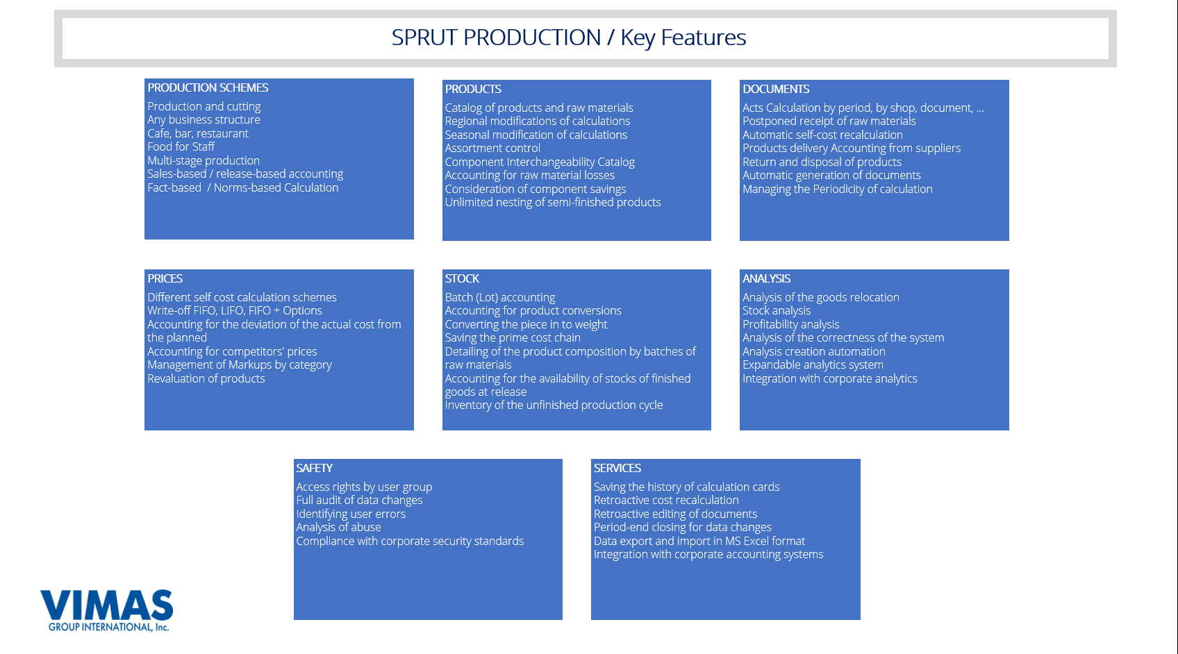 Подсистема СПРУТ PRODUCTION содержит всю необходимую функциональность для автоматизации подсистемы учёта разделки и производства общественного питания. Учёт строится на каталоге изделий, содержащих калькуляции (поддерживается сезонность, варианты калькуляций для разных магазинов), документообороте готовых продуктов и результатов разделки, актах производства изделий и разделки сырья. Поддерживаются несколько схем расчёта фактической и учёта плановой себестоимости, учёт расхода сырья по нормам и по фактическим затратам. Документооборот может строиться с применением различных схем автоматической разделки и производства.